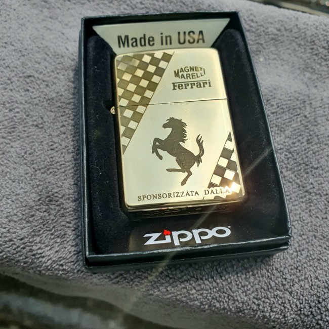 Bật Lửa Zippo Mỹ Đồng Ferrari Đáy Lõm Đời E-XVI ( Ruột Vàng , Có Tem Đỏ , Fullbox)